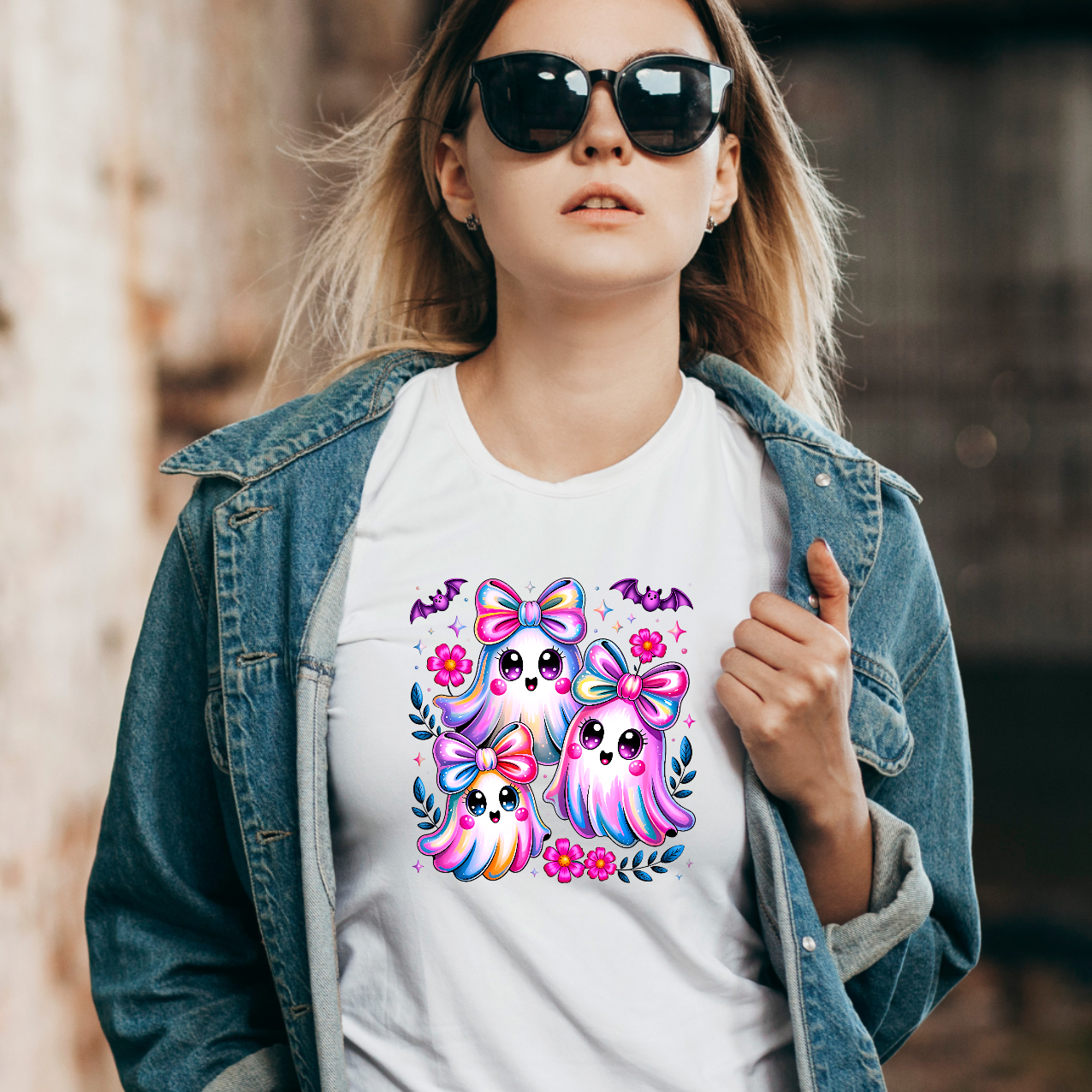 💪 This tee proves spooky can be sweet! Featuring adorable pink, girly ghosts dressed up in Halloween charm, it’s the perfect mix of festive fun and feminine flair.