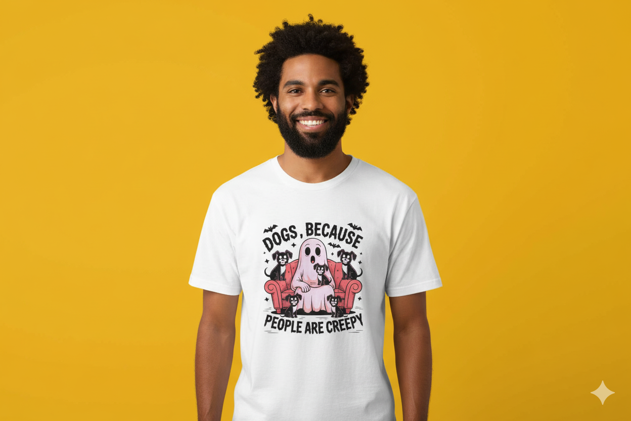 🐶 Creeped Out, Paws In: Social Anxiety, Solved 🛋️✨ Three dogs. One couch. Zero drama. This tee is for the introverts, the dog whisperers, and anyone who’s ever said “I’d rather hang with my pup.” Featuring a cozy cartoon crew and the brutally honest truth—Dogs, because people are creepy—this shirt is your emotional support statement piece.