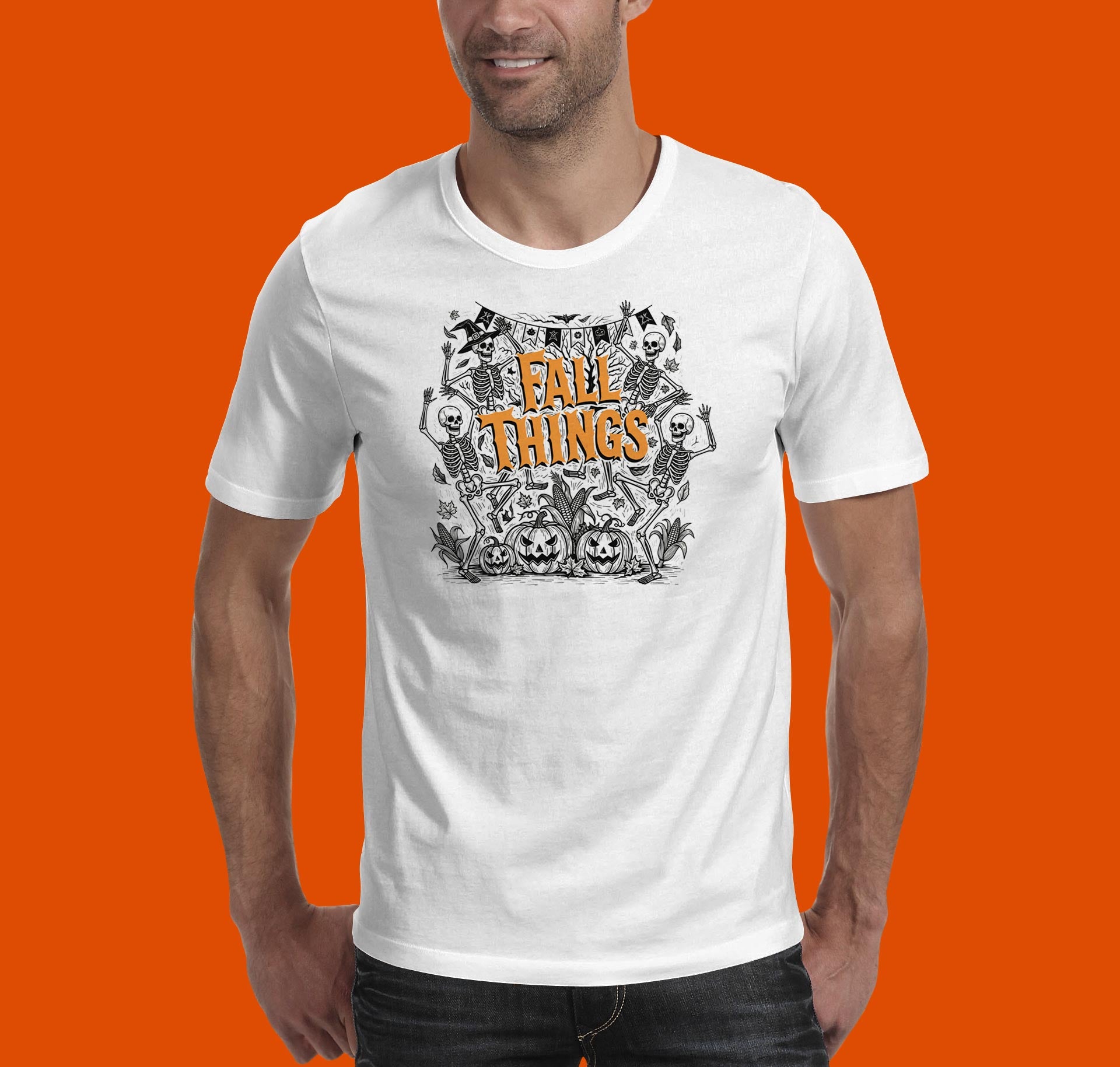 Are you ready to embrace the crisp air, falling leaves, and all things spooky? Our "Fall Things" t-shirt is the perfect way to show your love for the Halloween season! Featuring a playful design of dancing skeletons, grinning pumpkins, and festive fall foliage, this tee captures the whimsical spirit of autumn. Made from soft, breathable cotton, it's comfortable enough to wear all day long, whether you're heading to a pumpkin patch, a haunted house, or just enjoying a cozy night in. Available in a range of sizes, this shirt makes a fantastic gift for the Halloween enthusiast in your life (or a treat for yourself!). Get yours today and celebrate all the wonderful "Fall Things"!