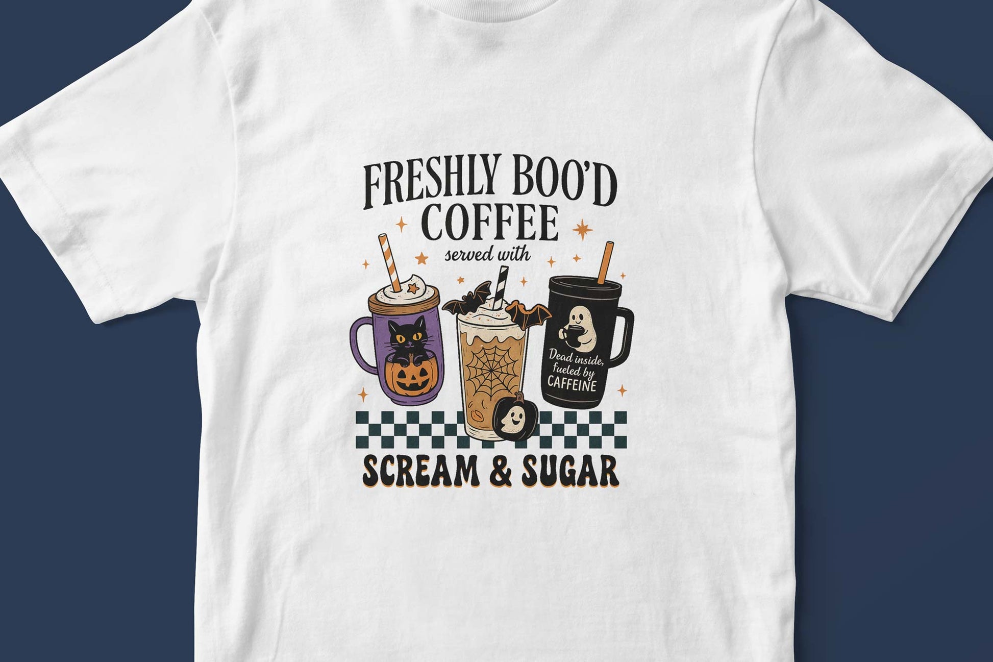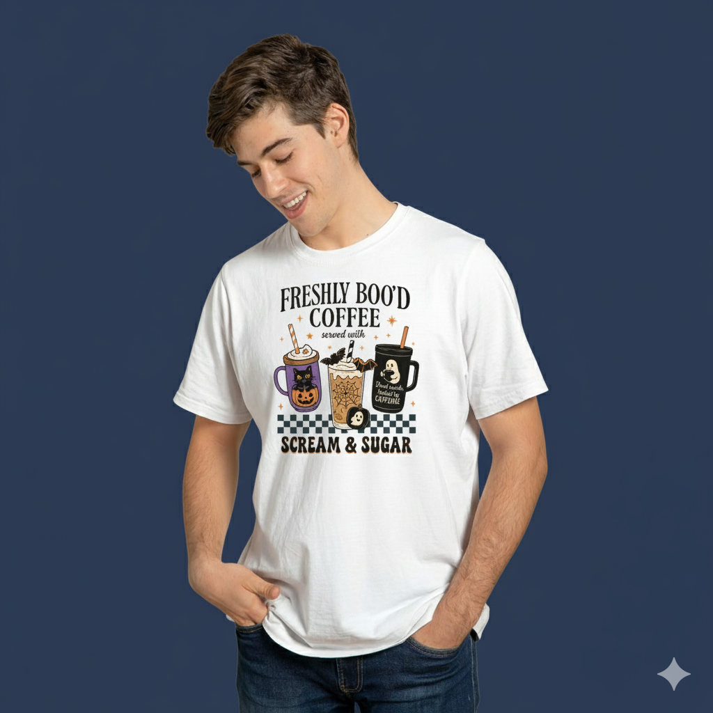 Start your day with a scream and a splash of sugar! This spooky-chic tee is brewed for Halloween lovers and caffeine fiends alike. Featuring three adorably haunted coffee cups—decked out with ghosts, bats, and pumpkins—this design serves up seasonal vibes with a playful twist. The bold text “Freshly Boo’d Coffee served with SCREAM & SUGAR” adds just the right amount of fright to your fit.