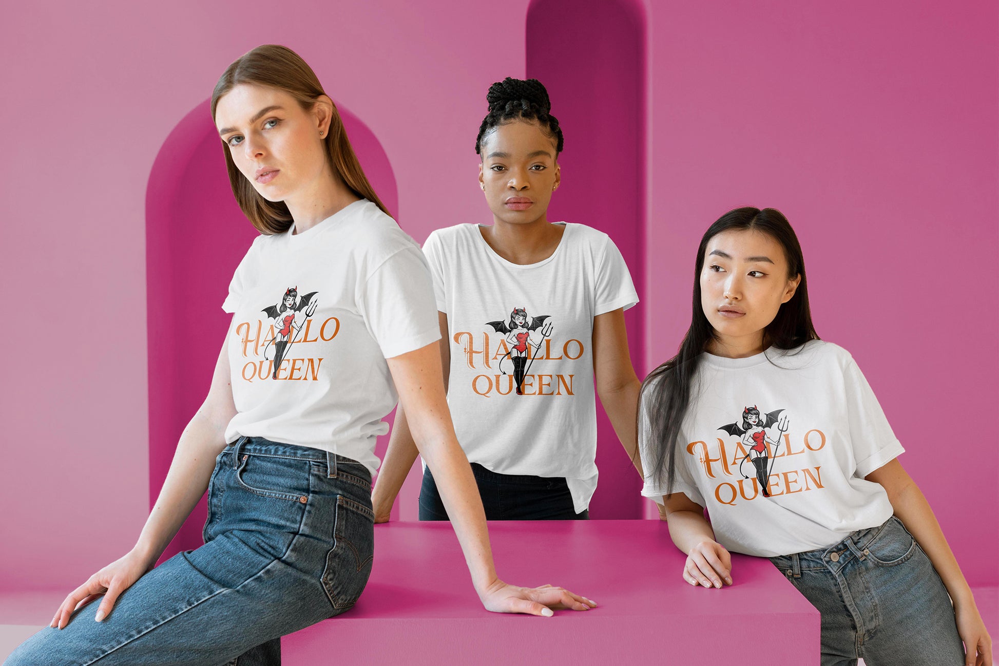 This isn't your damsel-in-distress Halloween tee. Our "Hallo Queen" design celebrates feminine power and playful confidence during the spooky season and beyond. Featuring a bold and unapologetic femme figure embracing her devilish side, this shirt reclaims traditional Halloween imagery with a modern, empowered twist.