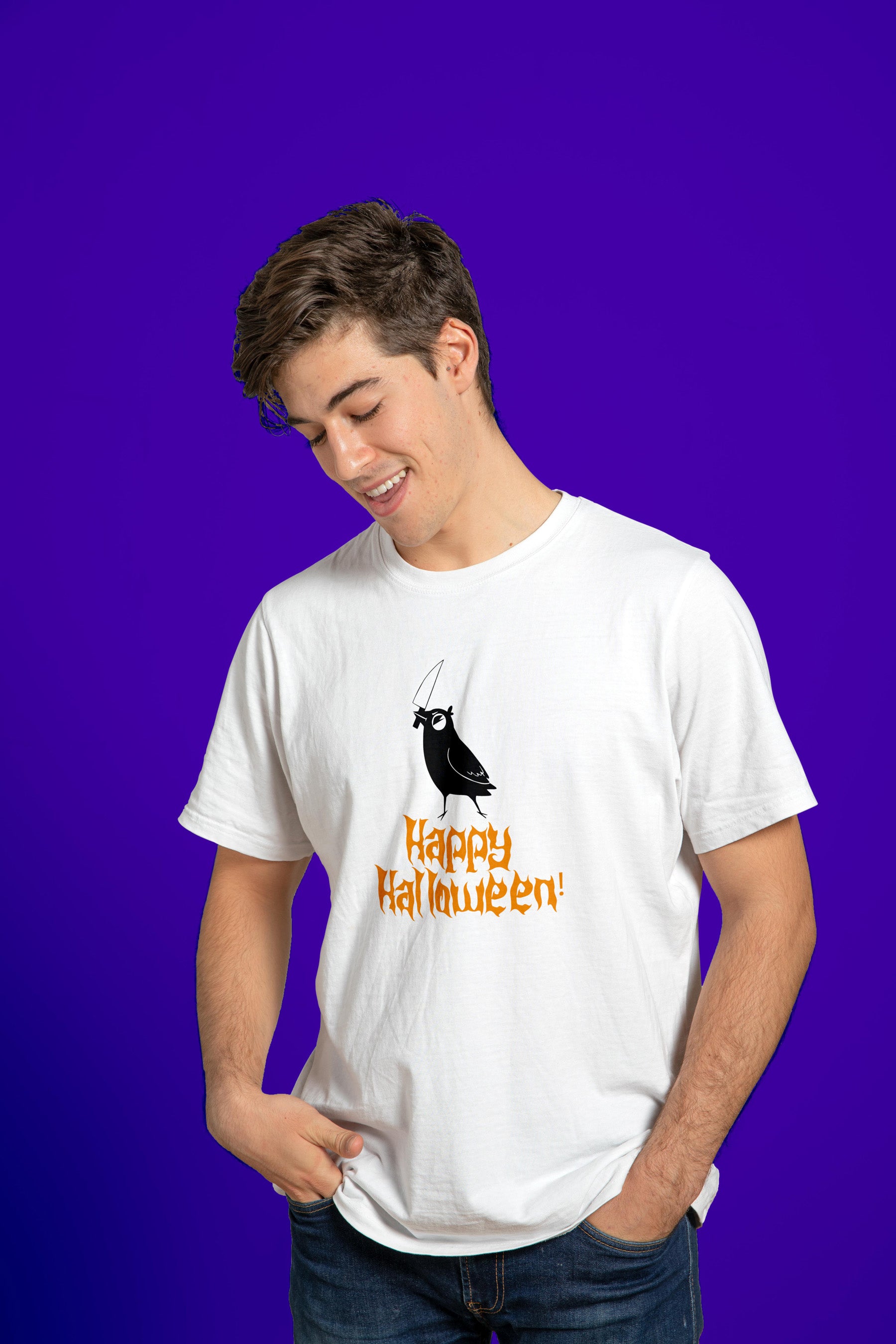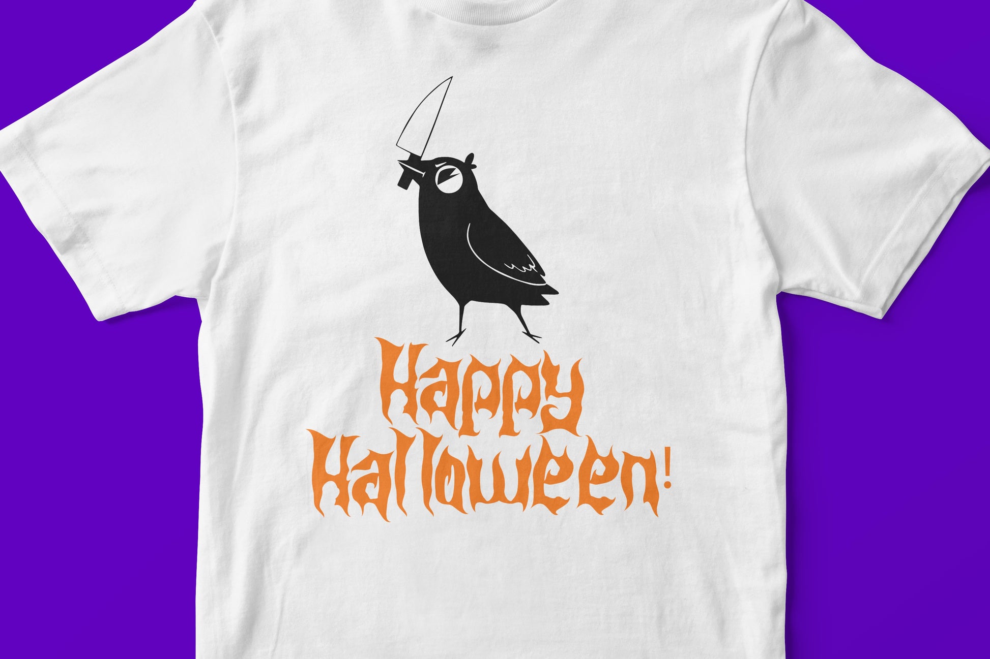 The text "Happy Halloween!" is written in a distressed, gothic-style font below the crow. The font is colored in a vibrant orange, which is a classic Halloween color and contrasts nicely with the white shirt and black crow. The distressed effect adds to the eerie, seasonal feel.