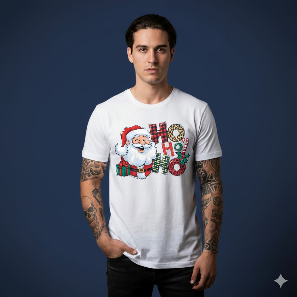 Santa’s got gifts, grins, and glam—wrapped in plaid, stripes, and leopard print. This tee is a holiday party in fabric form.