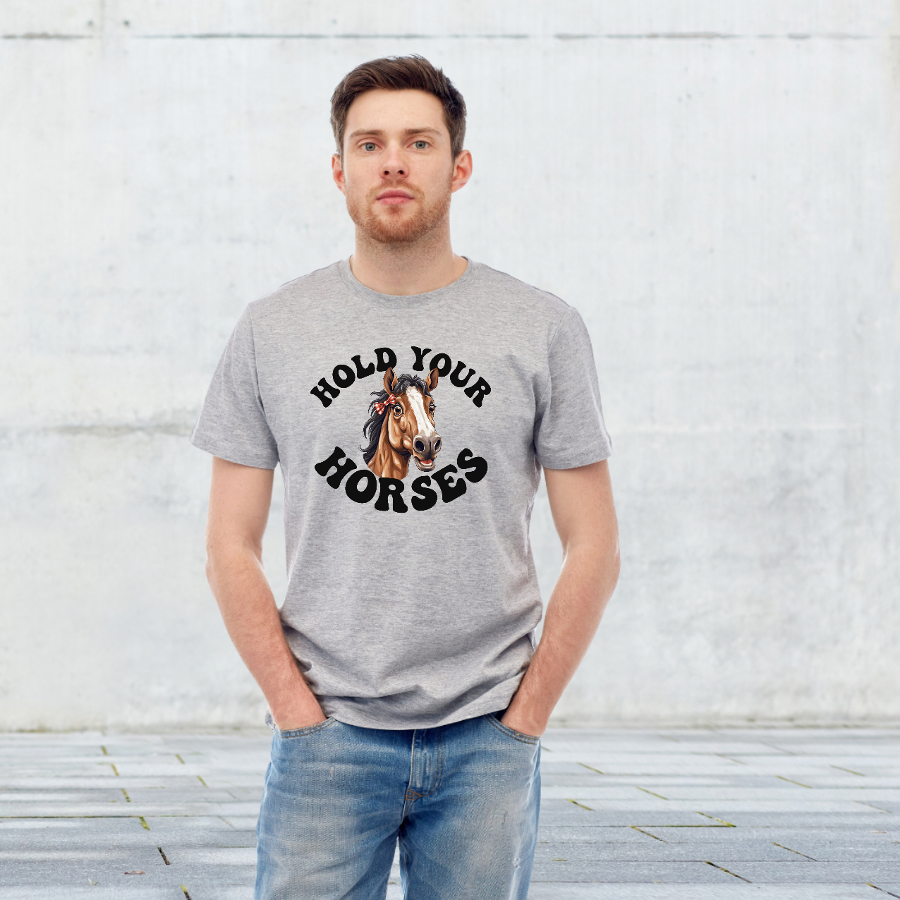 Perfect for casual outings, barn days, gifting your horse-obsessed friend, or just wearing when life feels a little too fast—this shirt says it best: hold your horses.