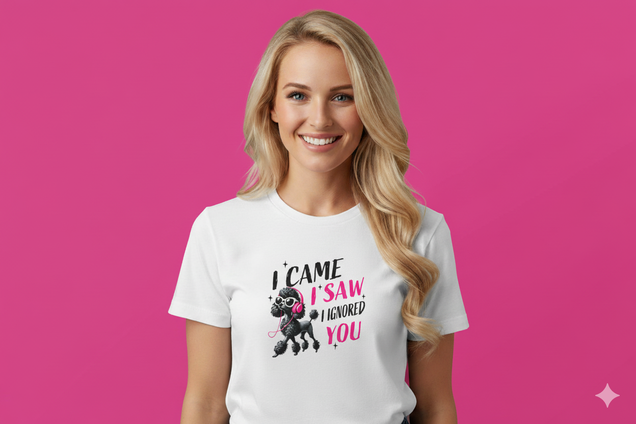Some dogs bark. This one vibes. Featuring a stylish black poodle rocking pink headphones, white shades, and a whole lot of attitude, this tee is for anyone who shows up, looks fabulous, and promptly tunes out the noise.
