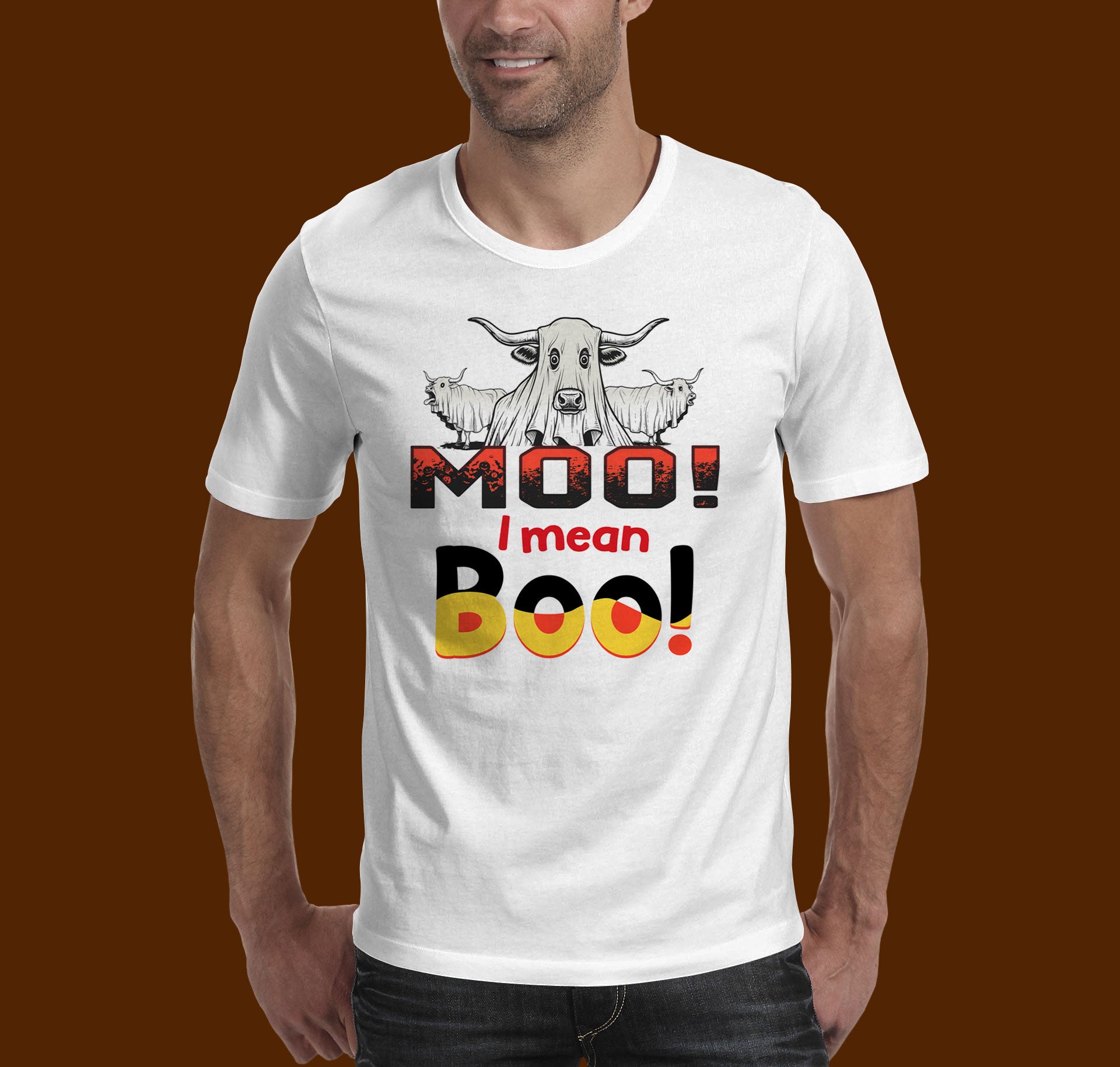 Get ready to stand out this spooky season with a t-shirt that's a little bit funny, and a whole lot of Halloween. Our exclusive "Moo! I mean Boo!" design features a hilarious twist on a classic ghost costume, perfect for anyone who loves cows as much as they love Halloween. This shirt is sure to get a laugh whether you're at a costume party, trick-or-treating, or just enjoying the festive season.