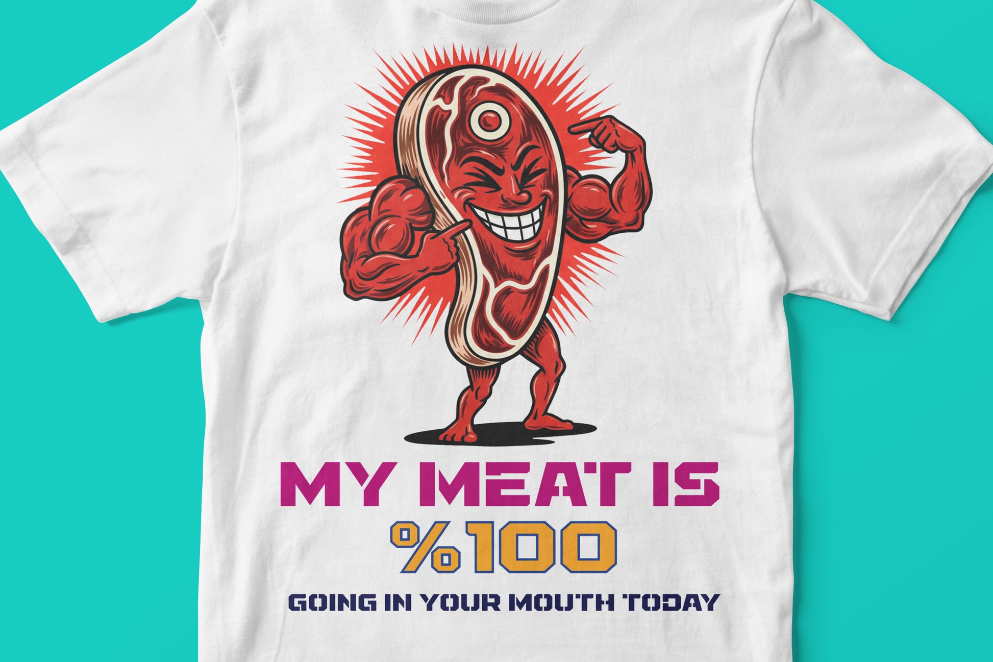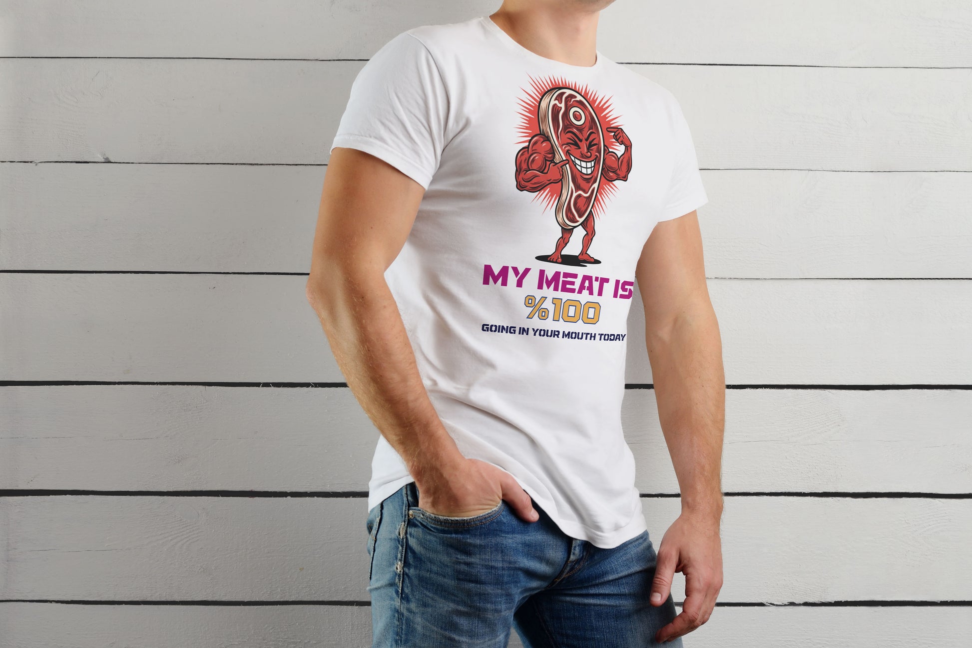 Fire up the grill and serve a side of laughter with this bold and hilarious t-shirt. Featuring a ridiculously buff cartoon steak that’s not shy about showing off, this shirt makes a clear and comical statement: "MY MEAT IS %100 GOING IN YOUR MOUTH TODAY."