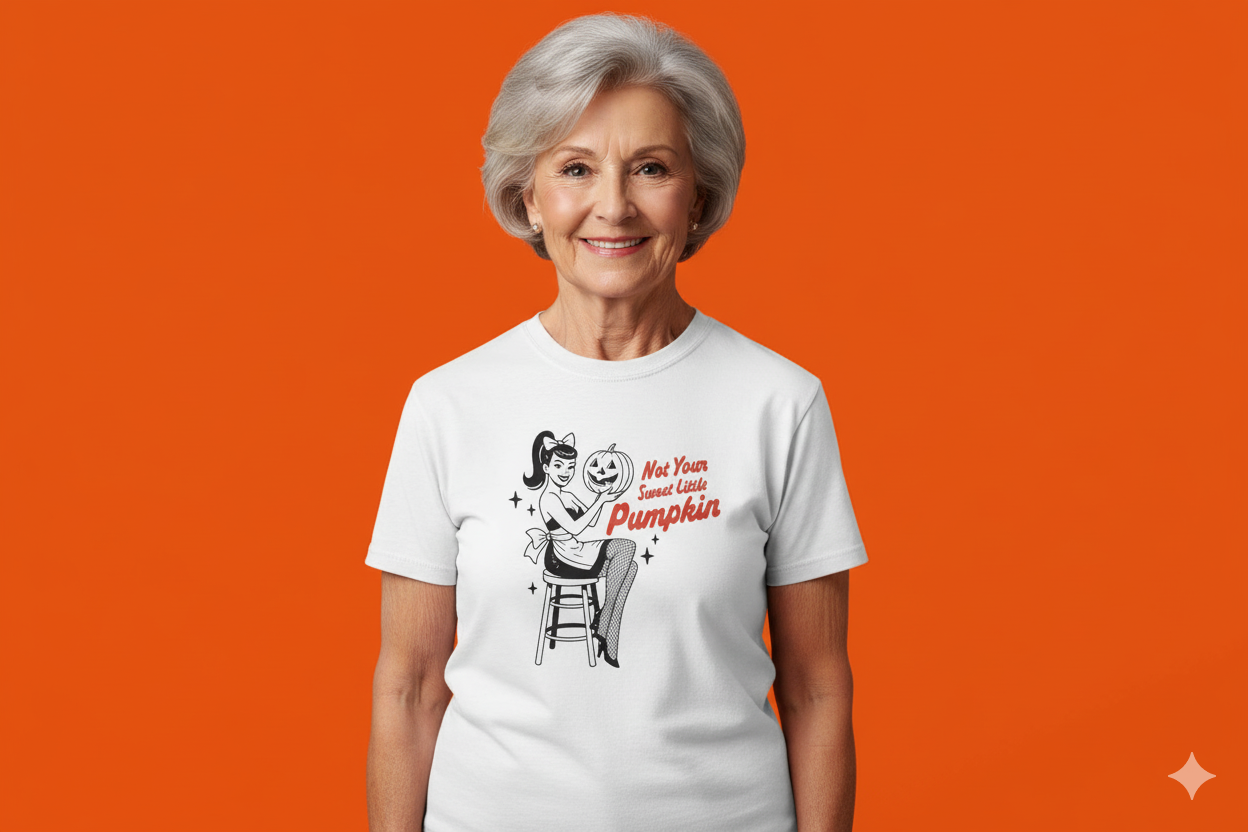 💋 Pumpkin Spice & Power Moves: Cute? Yes. Sweet? Not Always. 🖤 She’s got bows, heels, and a jack-o’-lantern grin—but don’t let the fishnets fool you. This tee is for the ones who serve retro glam with a side of rebellion. Featuring a pin-up queen perched on a stool with her pumpkin pal, it’s Halloween with attitude.