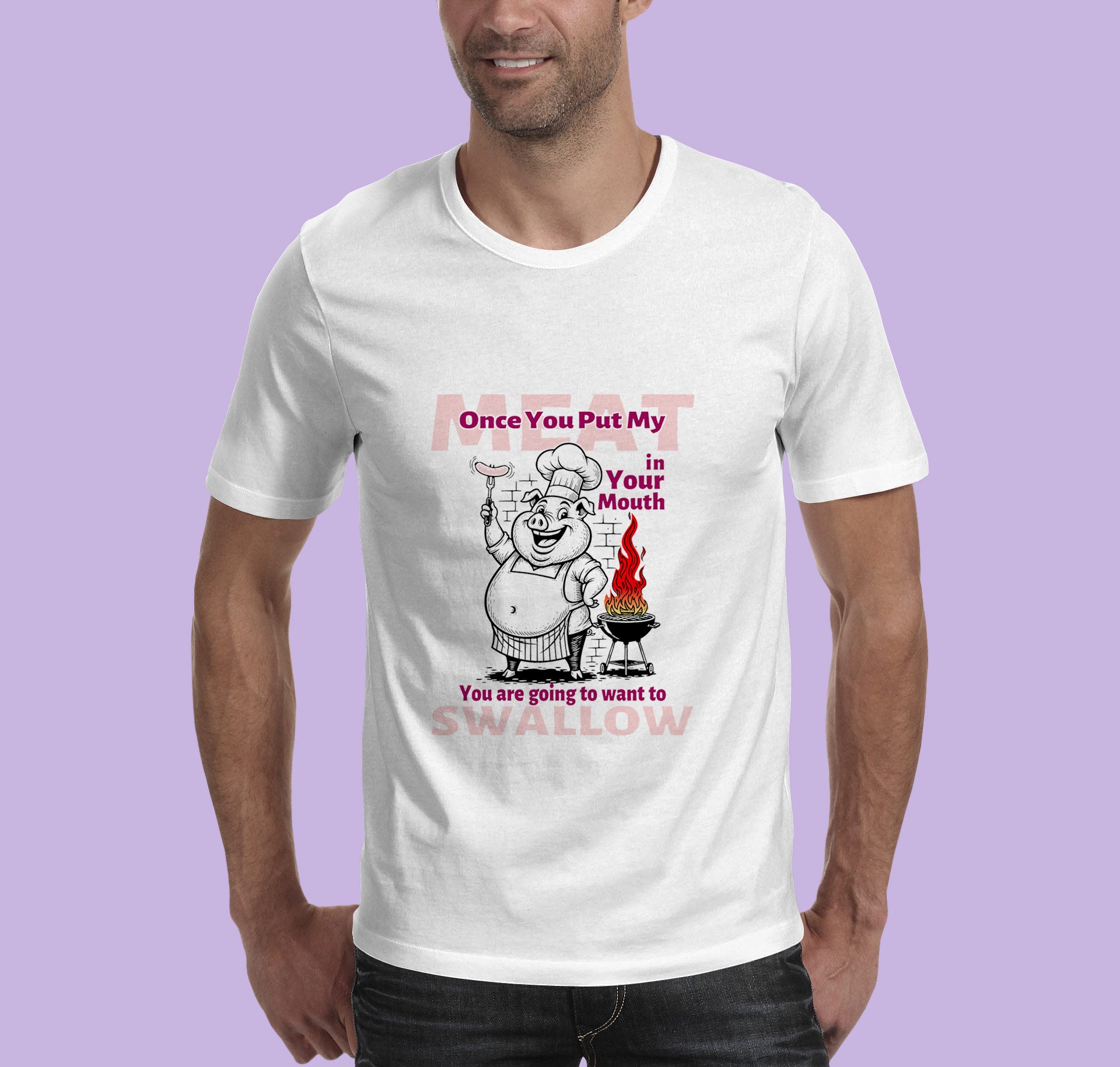 Prepare for double takes with our "Once You Put My Meat In Your Mouth" t-shirt! This cheeky design features a smiling pig chef with his BBQ and sausage, accompanied by the bold statement that's sure to get a reaction. It's a fantastic conversation starter and a testament to your bold sense of humor. Wear it to parties, casual gatherings, or whenever you want to bring a smile to people's faces (and maybe a blush!).