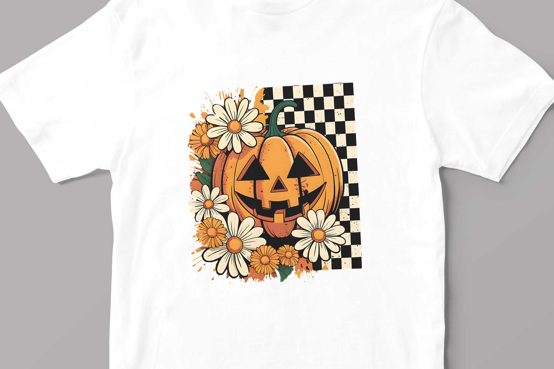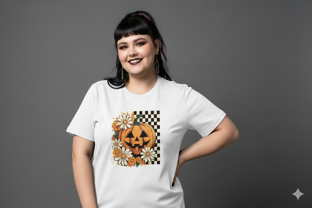 🎃🌼 Pumpkin Petals: Where Fright Meets Floral 🕸️✨ Who says Halloween can’t be cute? This tee mixes spooky sass with garden class—featuring a grinning jack-o’-lantern surrounded by cheerful daisies, bold checkerboard vibes, and a splash of orange chaos. It’s like your fall mood board exploded in the best way.
