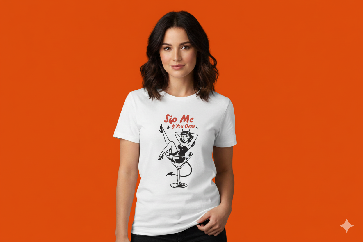 💋 Sip Me If You Dare: Stirred, Styled, and Slightly Sinister 🖤 This isn’t just a T-shirt—it’s a mood with heels on. Featuring a pin-up witch lounging in a martini glass like she owns the bar (and probably hexed the bartender), this tee is for the bold spirits who like their fashion shaken, not stirred.