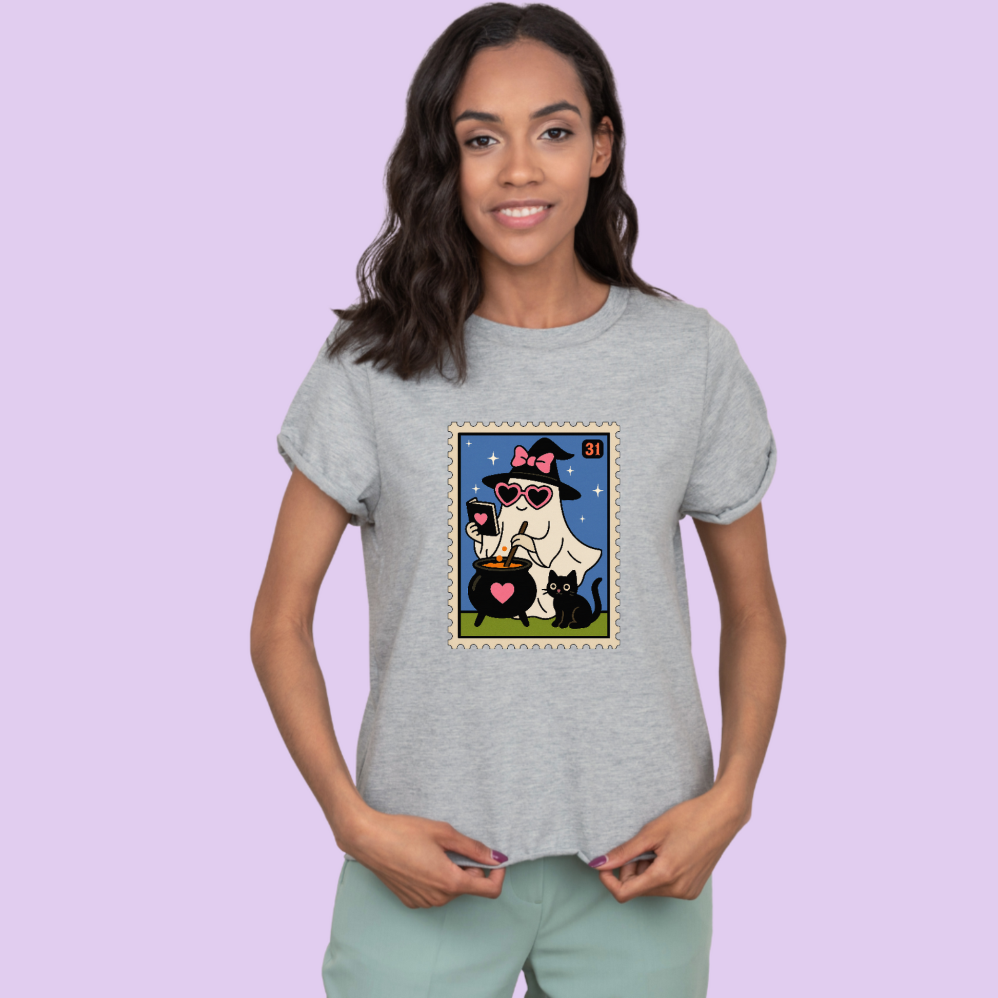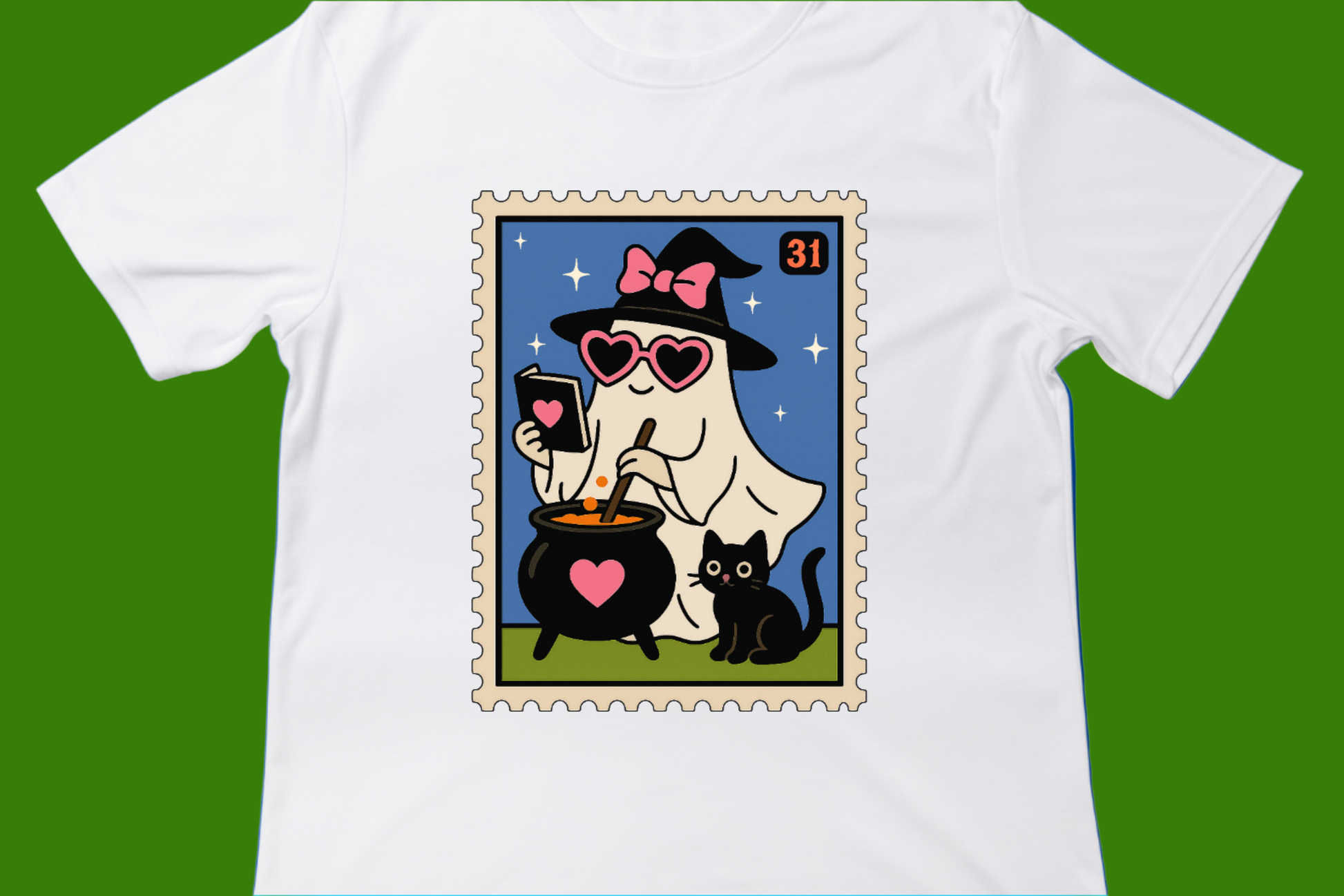 💪 This ghost’s got style. With pink heart shades, a chic witch hat, and her black cat sidekick, she’s stirring up potions and good vibes. The stamp-inspired design gives this Halloween tee a retro twist that’s equal parts spooky and sweet.