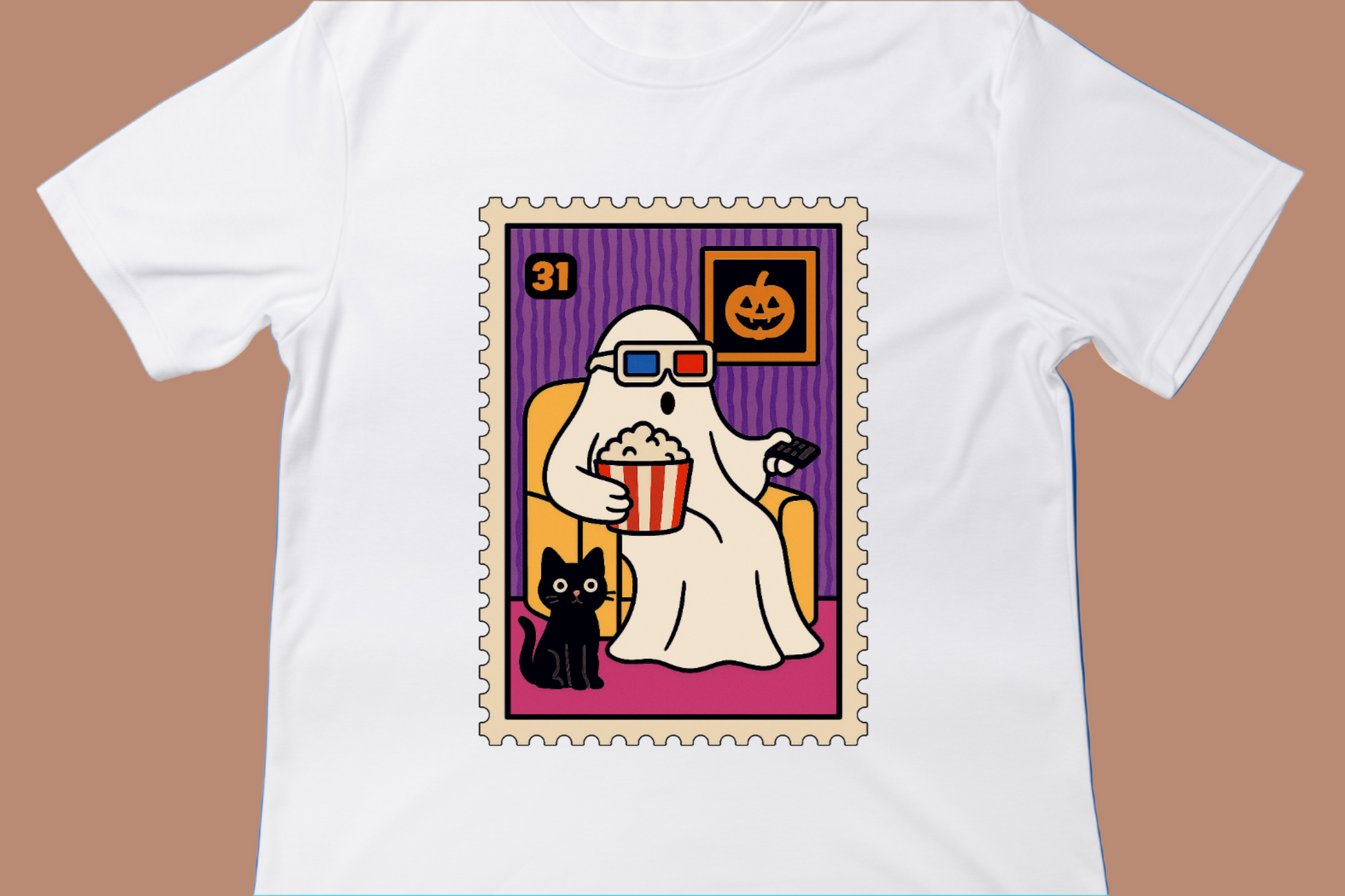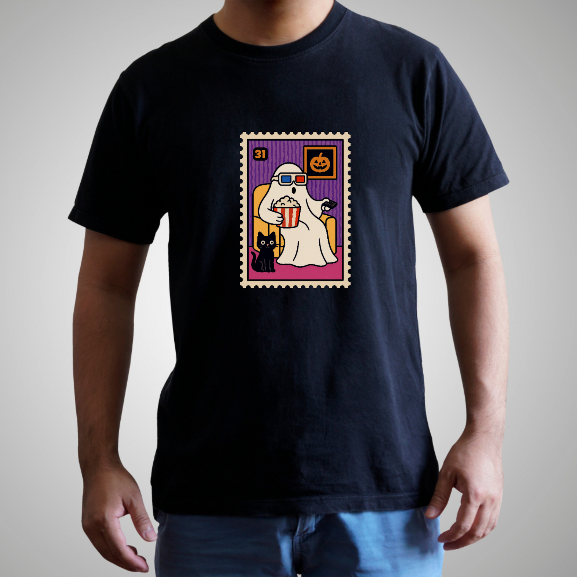 💪 Pop the corn and grab your blanket! This laid-back ghost knows how to spend Halloween — binge-watching spooky classics with their black cat sidekick. With a retro stamp-style design and bright fall colors, this tee is a comfy-cute must-have for every Halloween lover.