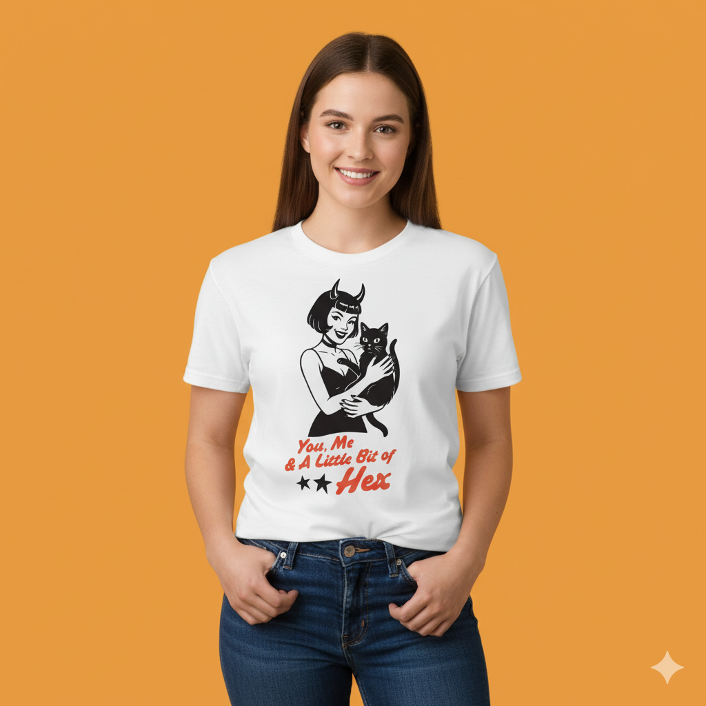 Unleash your inner enchantress with this spellbinding graphic tee. Featuring a fierce femme with devilish horns and her loyal black cat, this shirt is for those who walk the line between sweet and spooky. The bold design pops against crisp white cotton, while the cheeky phrase “You, Me & A Little Bit of Hex” adds just the right touch of mischief.